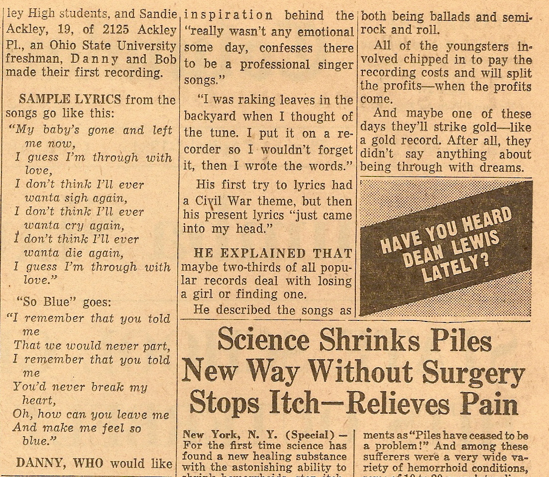 Bob Hill recalls - "Danny and I played guitar on the songs. The "Chet Atkins-y" part is Danny on "I Guess I'm Through With Love". I guess it was recorded at Magnetic. It was financed by Danny Beggs' father. (they owned the Beggs Building. I'm from Bexley), Some girl pals sang on it. There were about 600 pressed. The songs are original. I don't remember any type of distribution short of personal; leave a stack at the music store?"