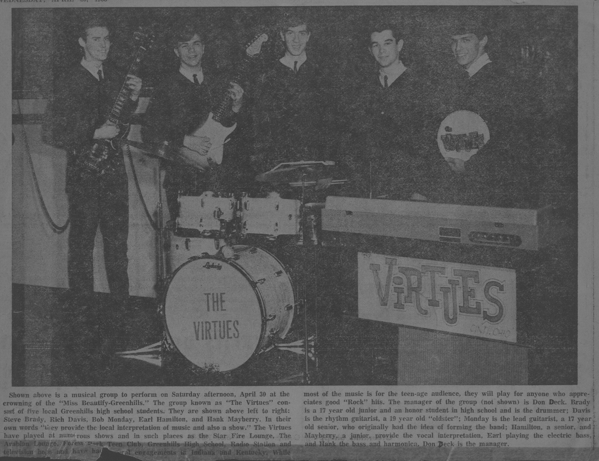 Bob Monday (lead guitar) Hank Mayberry (lead vocal) and Earl Hamilton (lead vocal & guitar) 1st met at Greenhills high school. After much practicing the 3 founding members started what would be their first rock band about 1963. To complete “the Virtues” they added Steve Brady on drums and keyboard. Rich Davis rhythm guitar and John Montgomery on bass. They played locally in Cincinnati developing what for most of them would be long careers in music. During this early time period their main completion was from the rock band at Finneytown high school just down the road where their friends “The Us Too Group” resided. And also their friends at Greenhills high and occasional jam sessions with “The Dantes”.